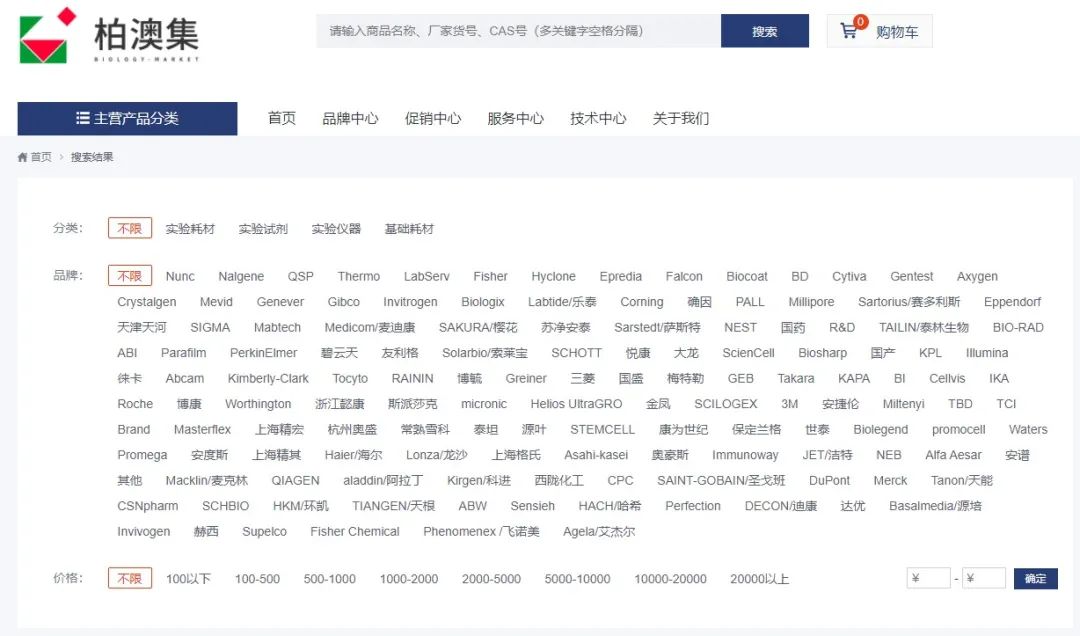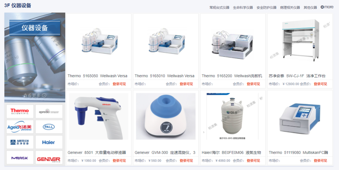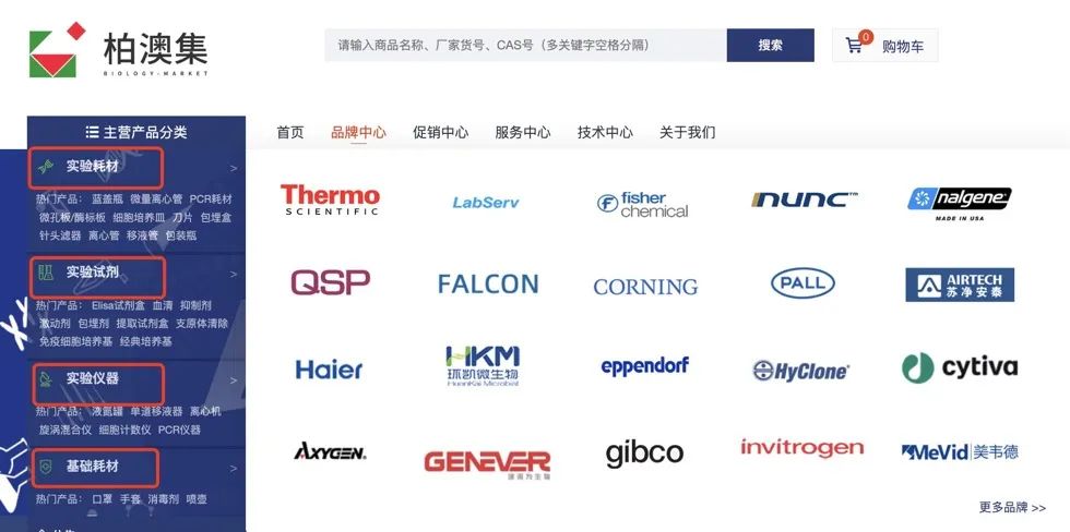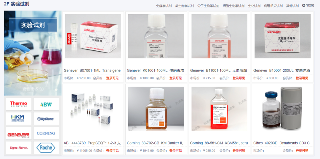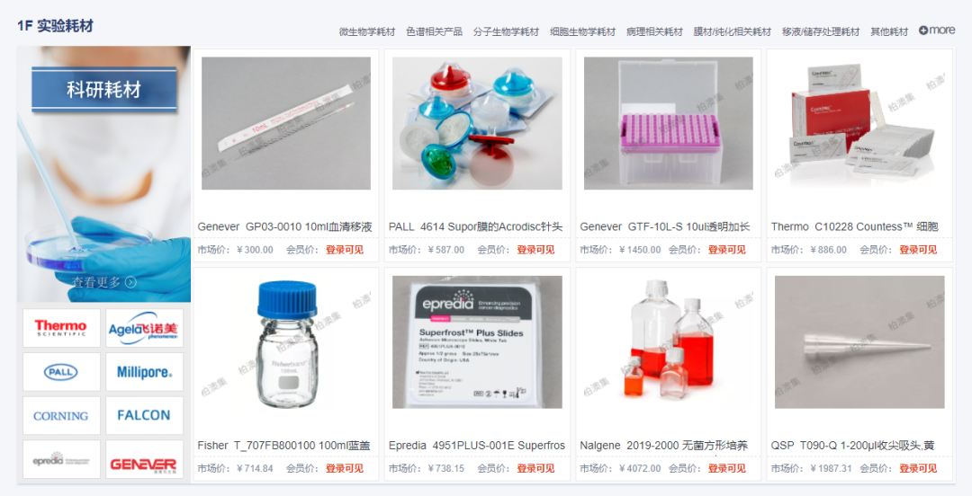 实验耗材、实验试剂、实验仪器、基础耗材,每个产品版块中都有相对应的热门产品推荐
