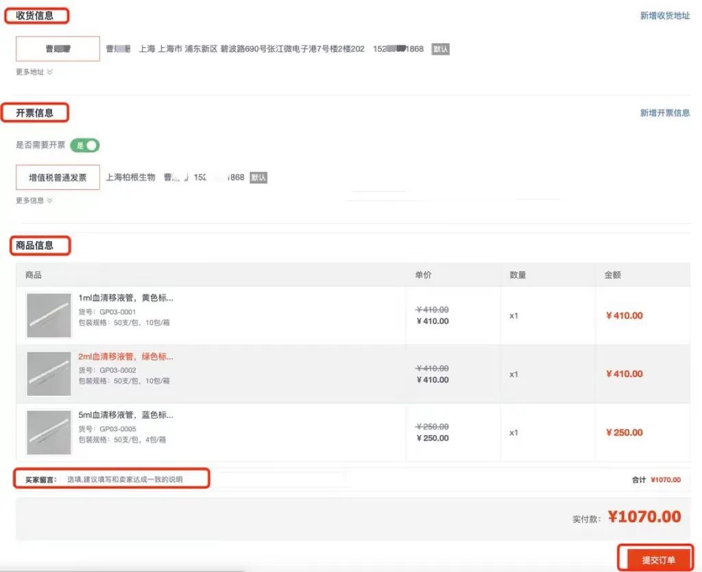 Part.4填写并核对订单信息:收货信息-开票信息-确认商品信息,还可以添加备注哦,最后确定无误后就可以提交订单啦。