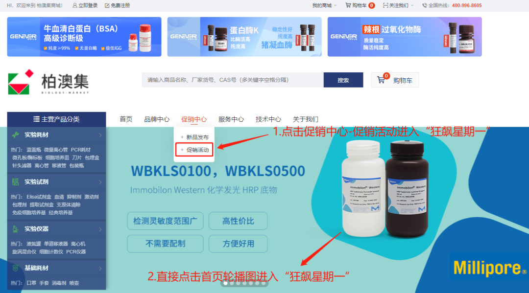 各位合作伙伴可在每个星期一在柏澳集商城:http://www.biology-market.com 通过以下两种方式参与每周的特惠活动: